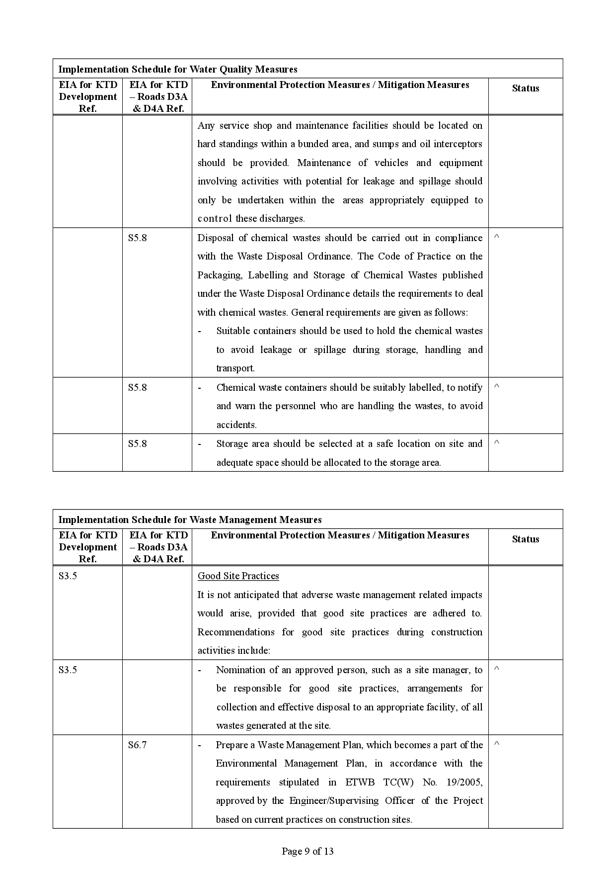 5.4 The Contractor has implemented environmental mitigation measures and requirement as stated in the EIA reports, the EPs and the EM&A Manuals. The implementation status of the mitigation measures during the reporting period is summarized in Appendix G.