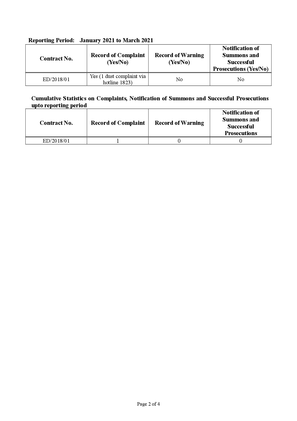 2. 1-hour TSP monitoring was conducted as scheduled in the reporting period. No Action/Limit Level exceedance was recorded. Due to the COVID-19 diagnosed case confirmed on 4 Jan 2021 in The Hong Kong Society for the Blind’s Factory cum Sheltered Workshop [AM4(A)], the workshop was closed for cleaning and disinfection work from 5 to 25 Jan 2021. No impact monitoring was conducted between 5 and 25 January 2021.