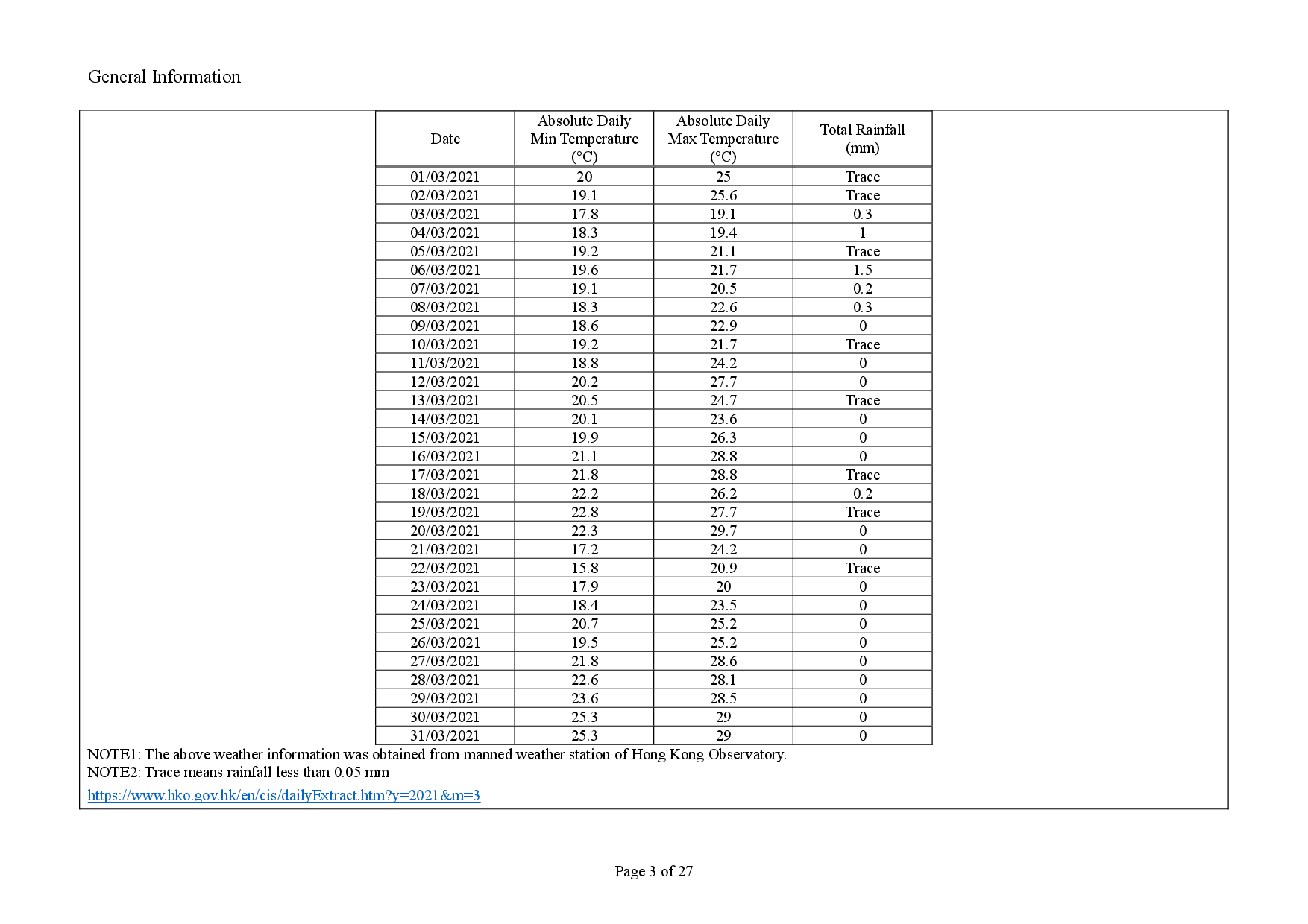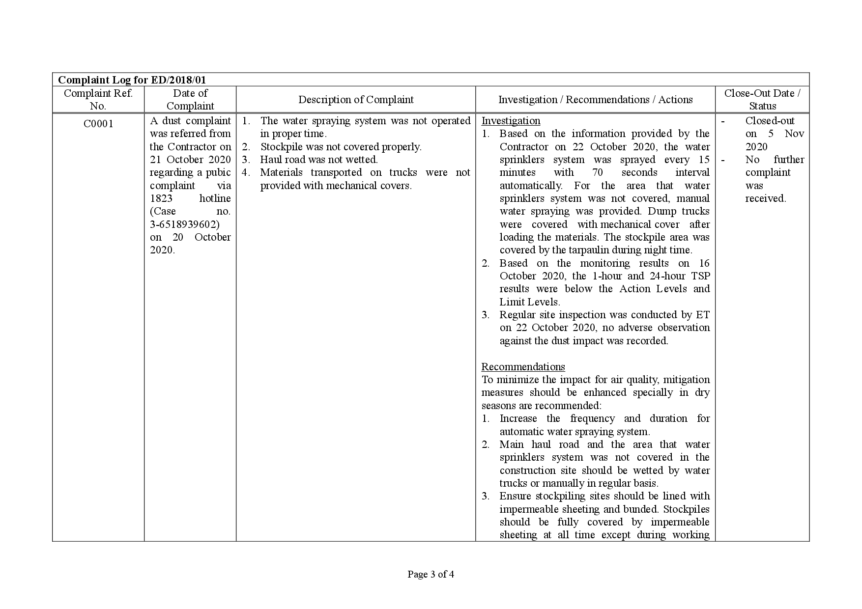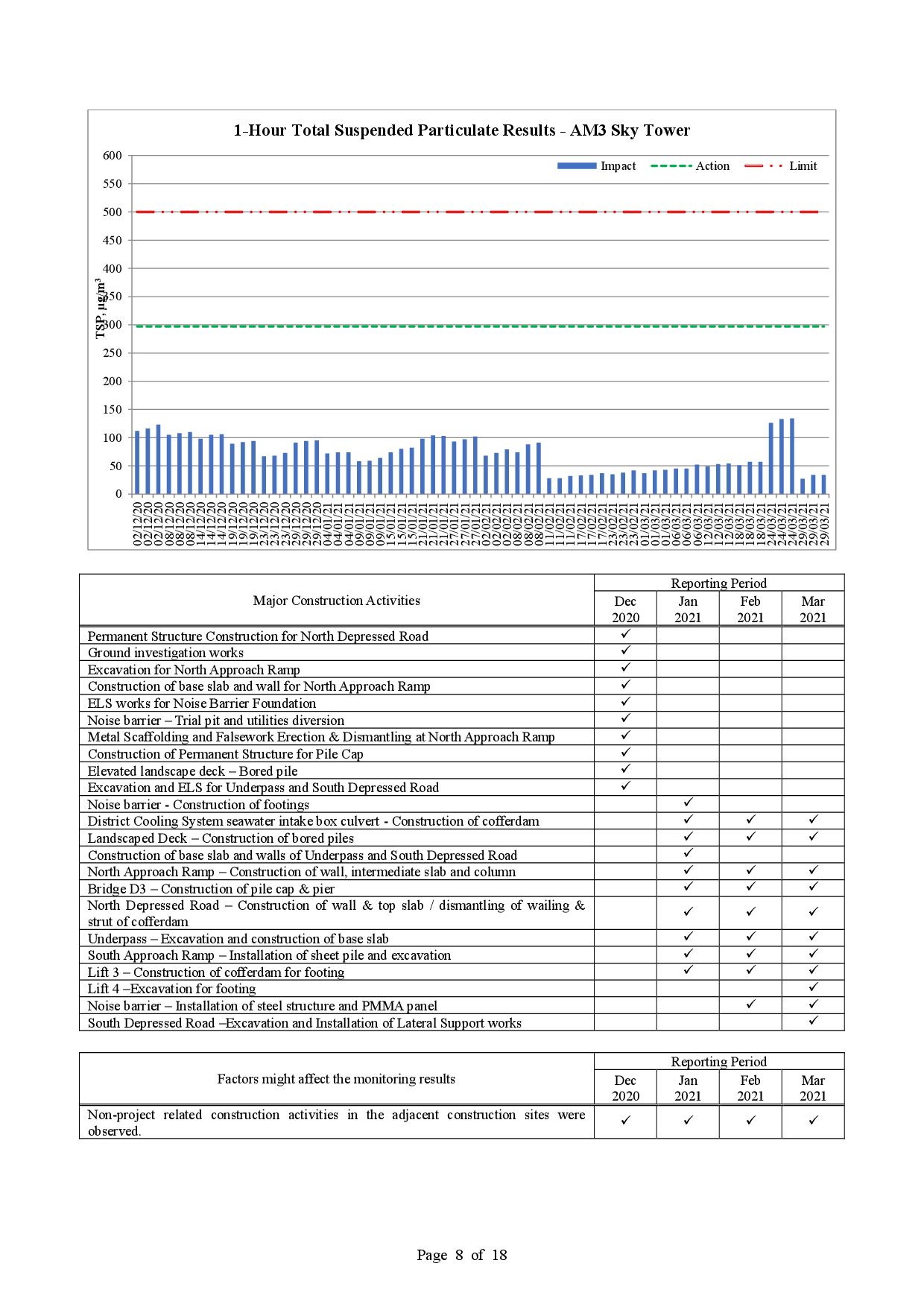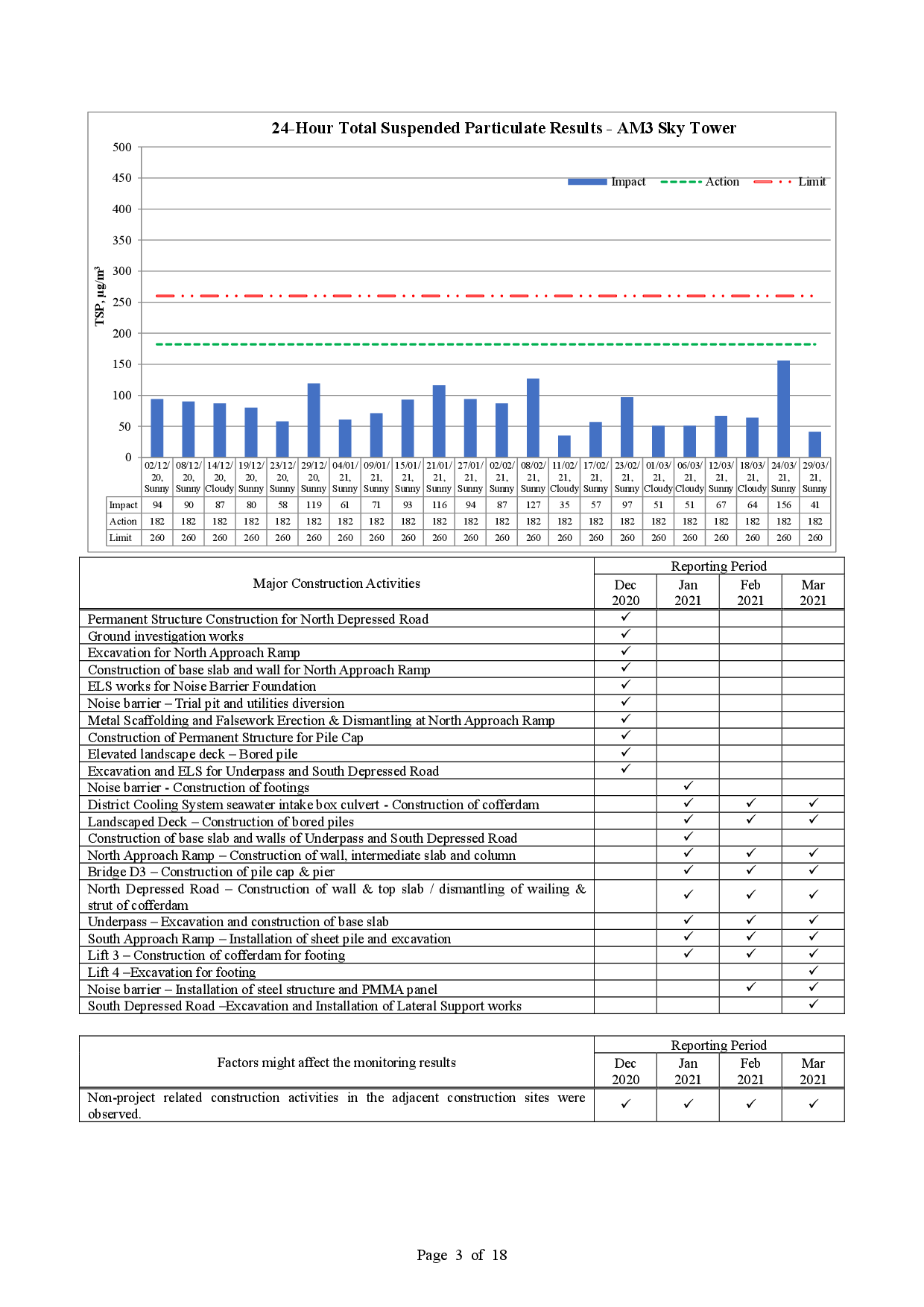 2.46 24-hour TSP monitoring results recorded in January and February 2021 at AM3 were higher than the Scenario 1 (Mid 2009 to Mid 2013) prediction but lower than the Scenario 2 (Mid 2013 to Late 2016) prediction in the EIA Report. 24-hour TSP monitoring results recorded in March 2021 at AM3 were higher than the Scenario 1 (Mid 2009 to Mid 2013) prediction and also the Scenario 2 (Mid 2013 to Late 2016) prediction in the EIA Report. Non-project related construction activities in the adjacent construction sites were observed during the reporting period and may affect the monitoring results.