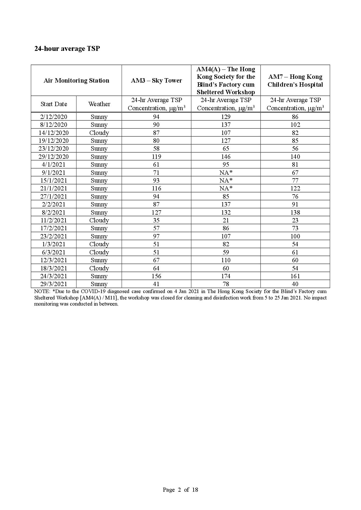 3. 24-hour TSP monitoring was conducted as scheduled in the reporting period. No Action/Limit Level exceedance was recorded. Due to the COVID-19 diagnosed case confirmed on 4 Jan 2021 in The Hong Kong Society for the Blind’s Factory cum Sheltered Workshop [AM4(A)], the workshop was closed for cleaning and disinfection work from 5 to 25 Jan 2021. No impact monitoring was conducted between 5 and 25 January 2021.