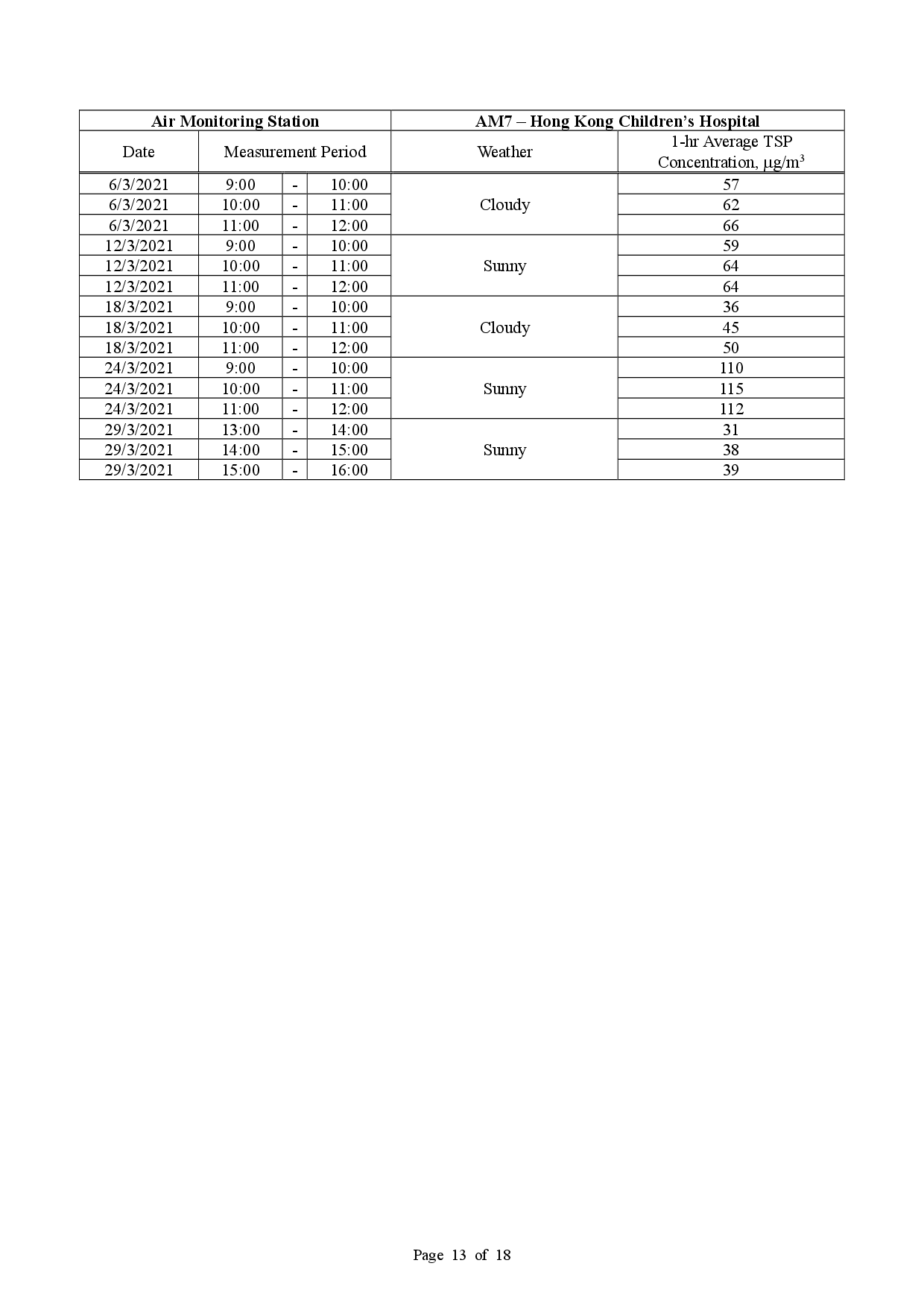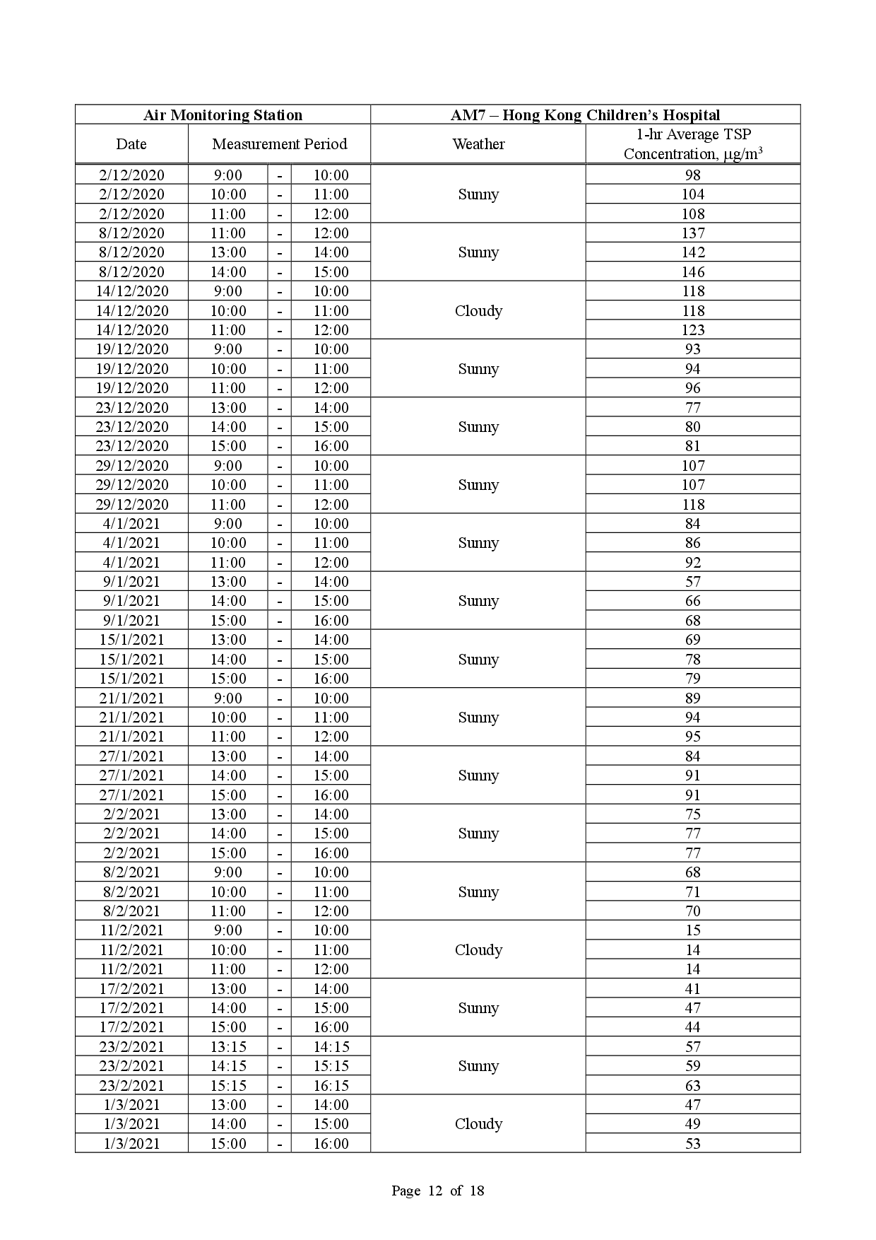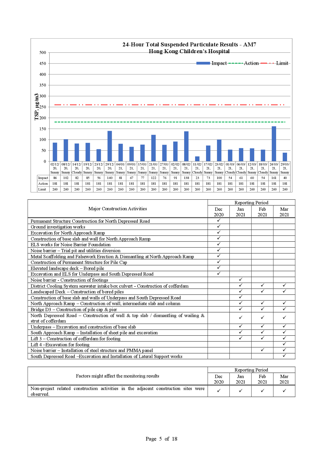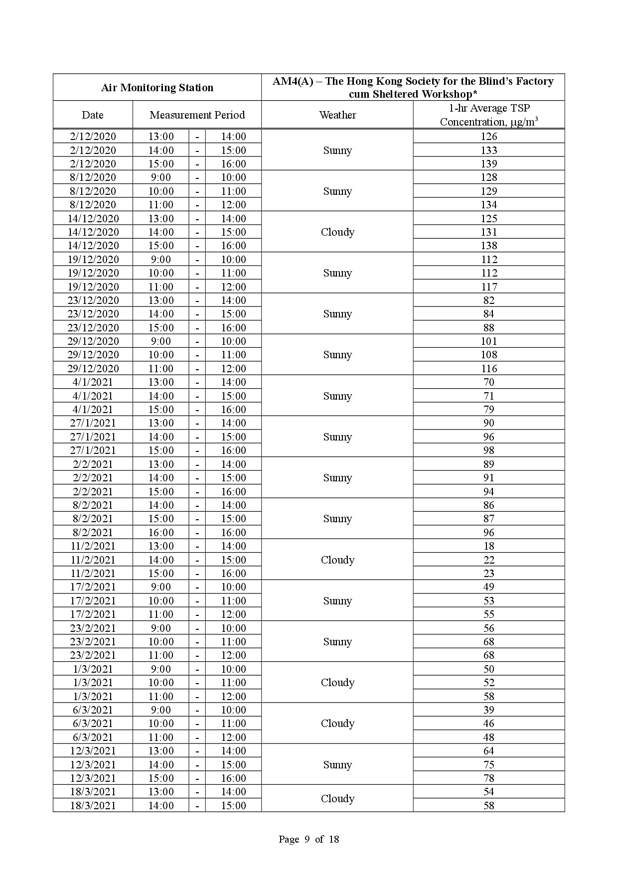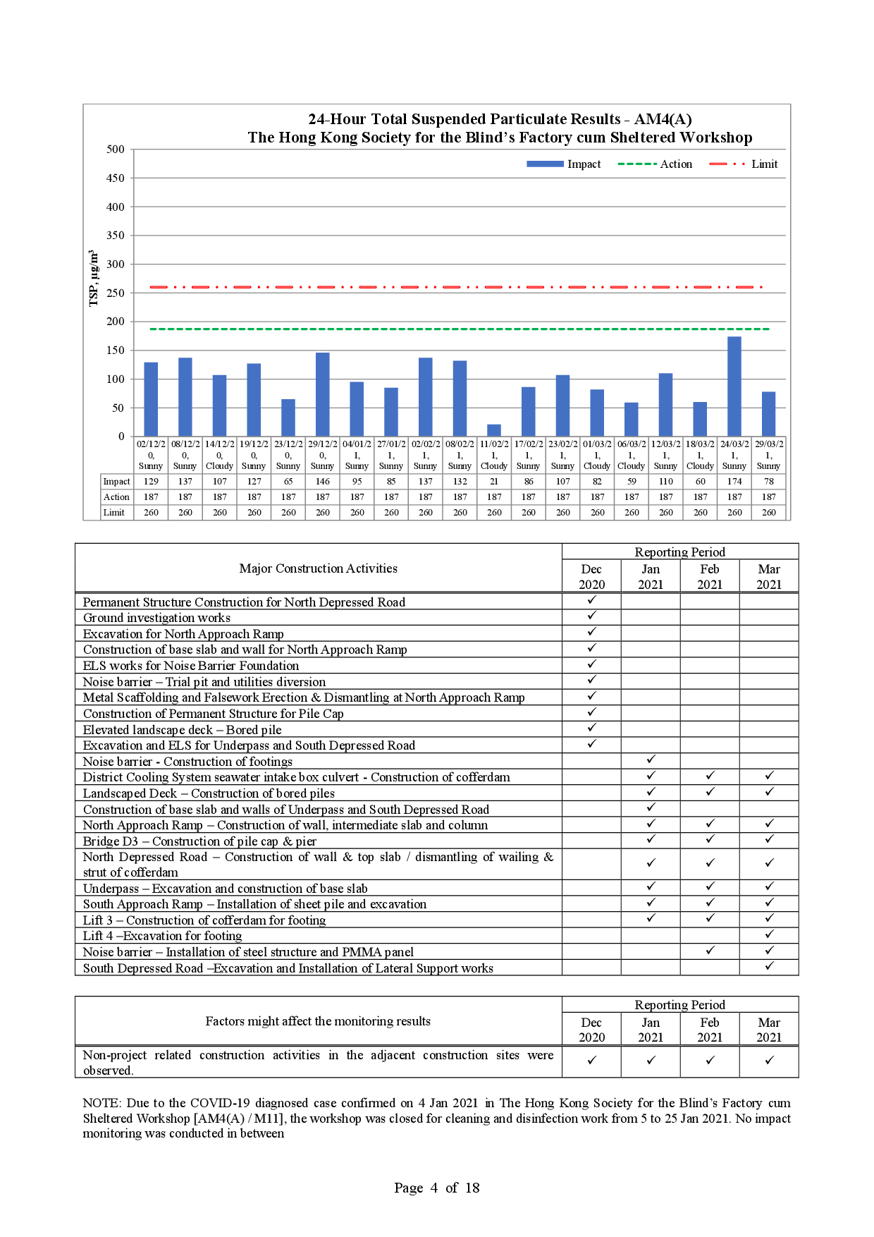 7.7 24-hour TSP monitoring was conducted as scheduled in the reporting period. No Action/Limit Level exceedance was recorded. Due to the COVID-19 diagnosed case confirmed on 4 January 2021 in The Hong Kong Society for the Blind’s Factory cum Sheltered Workshop [AM4(A)], the workshop was closed for cleaning and disinfection work from 5 to 25 January 2021. No impact monitoring was conducted between 5 and 25 January 2021.
