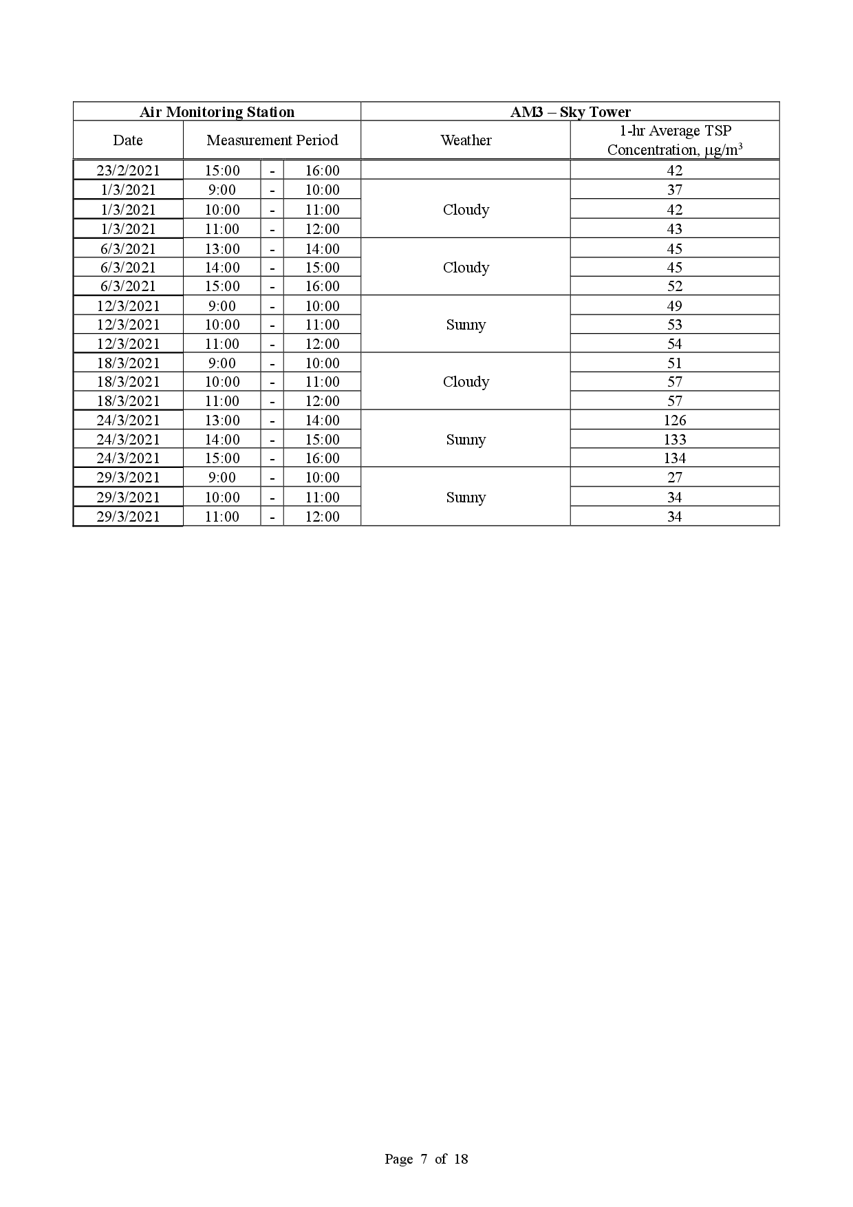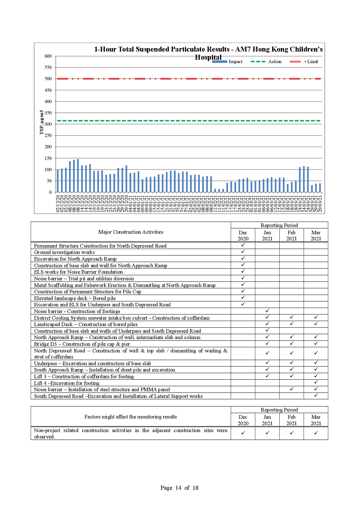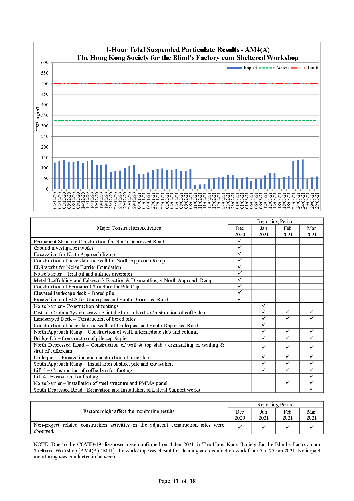7.6 1-hour TSP monitoring was conducted as scheduled in the reporting period. No Action/Limit Level exceedance was recorded. Due to the COVID-19 diagnosed case confirmed on 4 January 2021 in The Hong Kong Society for the Blind’s Factory cum Sheltered Workshop [AM4(A)], the workshop was closed for cleaning and disinfection work from 5 to 25 January 2021. No impact monitoring was conducted between 5 and 25 January 2021.