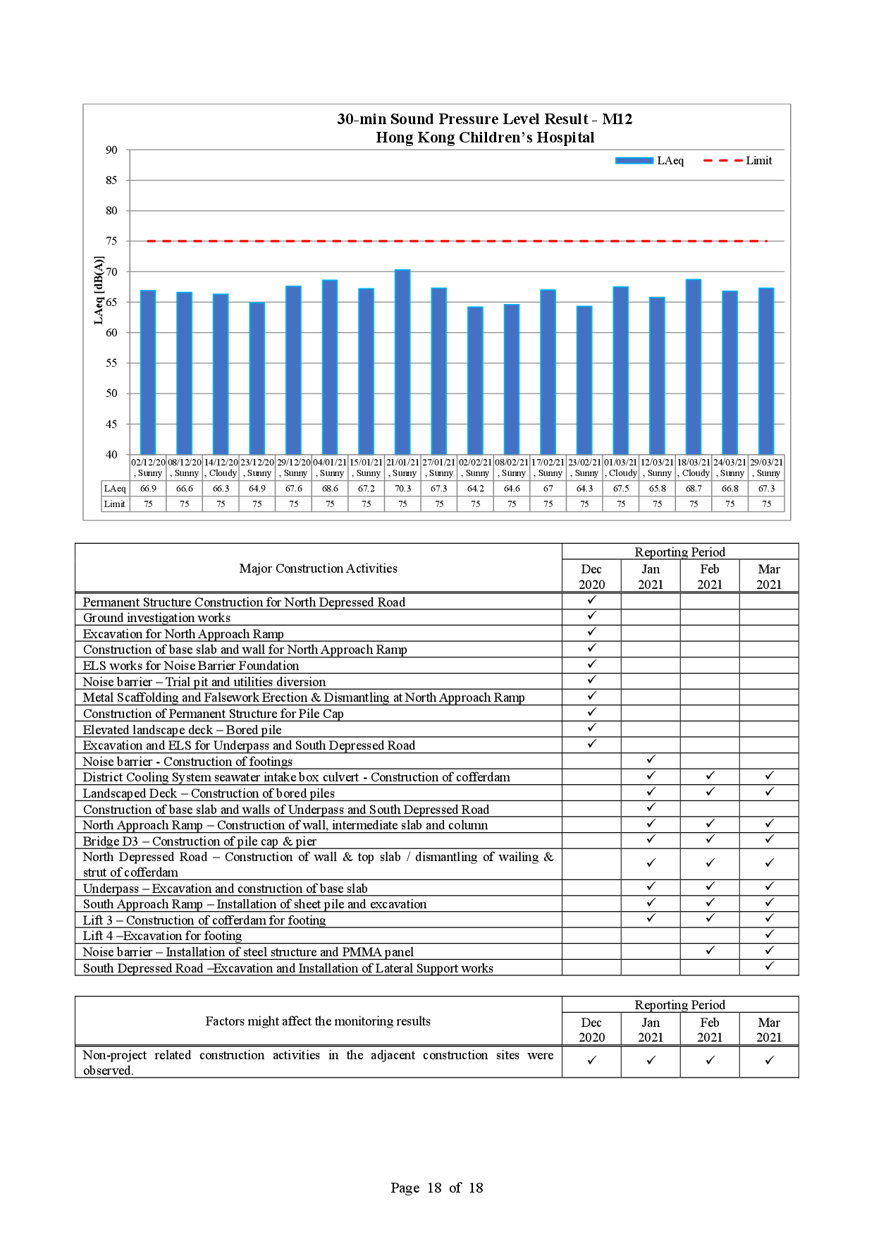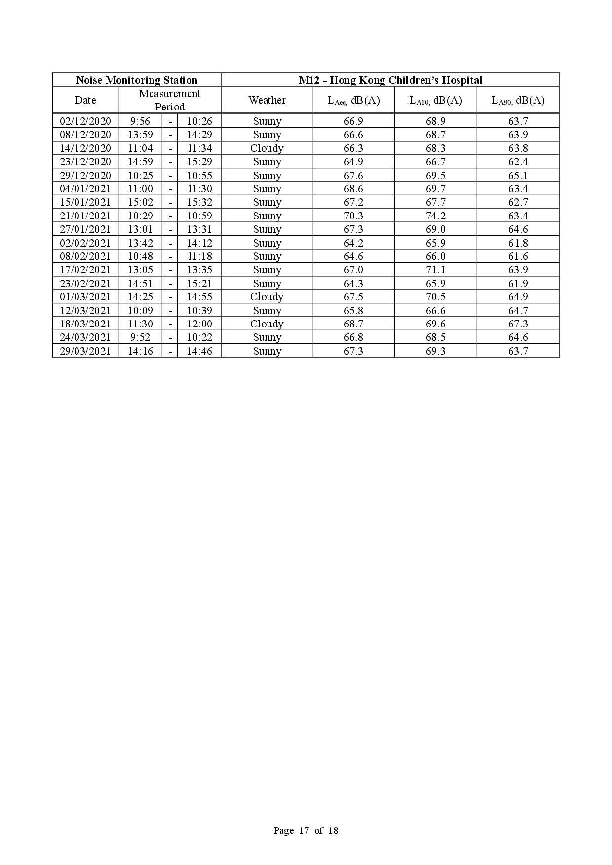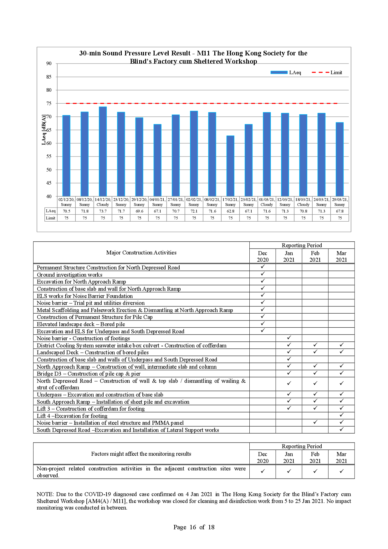 6.3 Construction noise monitoring was conducted as scheduled in the reporting period. No Action/Limit Level exceedance was recorded. Due to the COVID-19 diagnosed case confirmed on 4 Jan 2021 in The Hong Kong Society for the Blind’s Factory cum Sheltered Workshop [M11], the workshop was closed for cleaning and disinfection work from 5 to 25 Jan 2021. No impact monitoring was conducted between 5 and 25 January 2021.