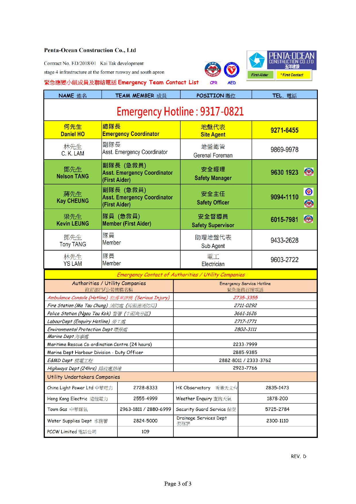 1.6 The project organization chart and emergency team and with respect to the EM&A programme is shown in Appendix A. Information of key personnel contact names and telephone numbers are summarized in Table 1.1.